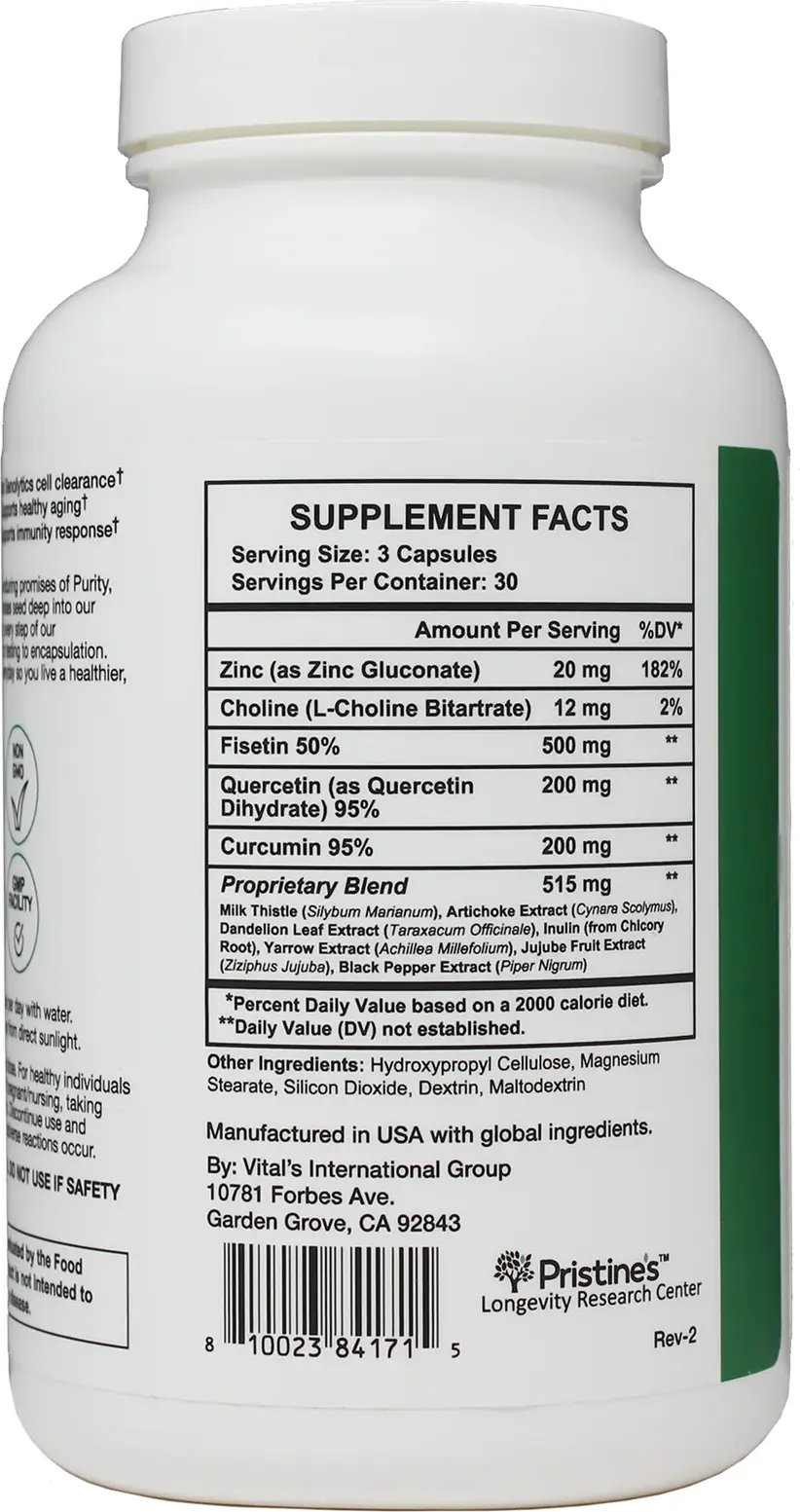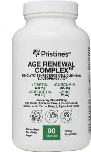 „PRISTINE Age Renewal Complex – ფისეტინი, კვერცეტინი, კურკუმინი და ცინკი. მხარს უჭერს ახალგაზრდობას, დეტოქსს, იმუნიტეტს, ანტიოქსიდანტურ დაცვას და სხეულის ვიტალობას.“