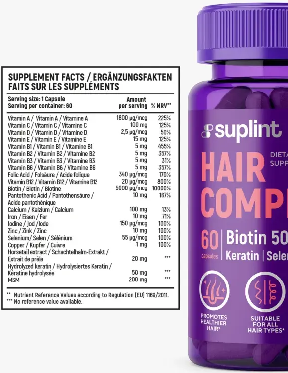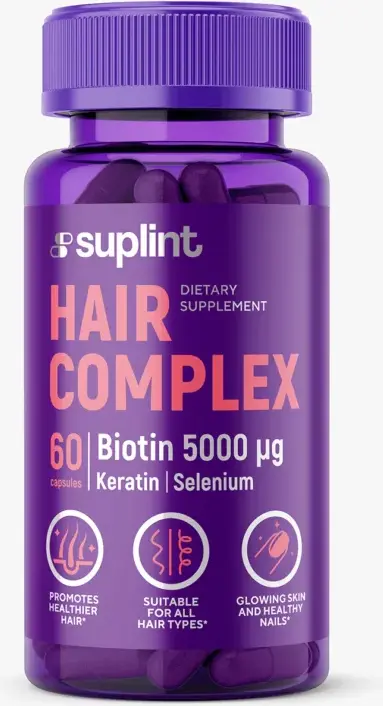 🌿 Suplint Hair Complex – ბუნებრივი მხარდაჭერა თმის სიმკვრივისა და ჯანმრთელობისთვის, 60 კაფსულა ყოველდღიური გამოყენებისთვის.