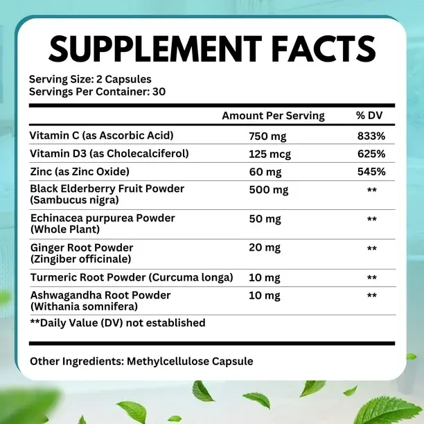 • ✔ 500 მგ საზუქის (Sambucus) ექსტრაქტი, 750 მგ ვიტამინი C, 60 მგ ცინკი, 5000 UI ვიტამინი D