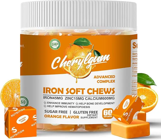 Cherylgum Iron Chews – 45mg რკინა + 100mg ვიტამინი C გემრიელი ფორთოხლის გემოთი. ენერგია, ჯანმრთელი კანი, თმა და ფრჩხილები რკინის დეფიციტის წინააღმდეგ.