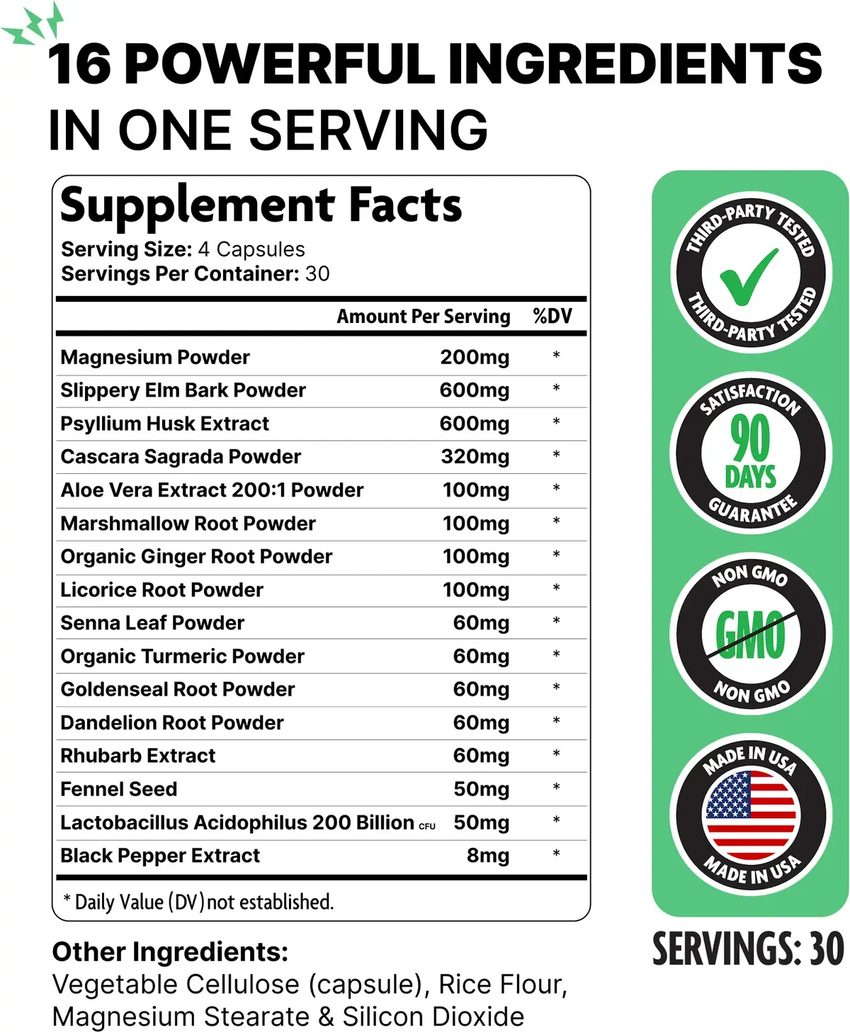 • ✔ 16 ინგრედიენტი საჭმლის მონელების მხარდაჭერისთვის, მათ შორის Slippery Elm 600 მგ, Psyllium 600 მგ, Magnesium 200 მგ