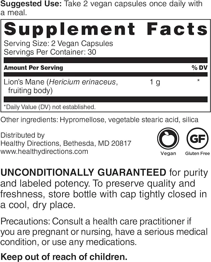 (Lions Mane) – ტრადიციული ტვინის მხარდაჭერა 🧠 კოგნიტიური ჯანმრთელობისთვის. 💊 1,000 მგ დღიური დოზა, 🌿 ვეგანური, ✅ გლუტენისგან თავისუფალი, 🏭 სამჯერ შემოწმებული ხარისხით, აშშ-ში დამზადებული.