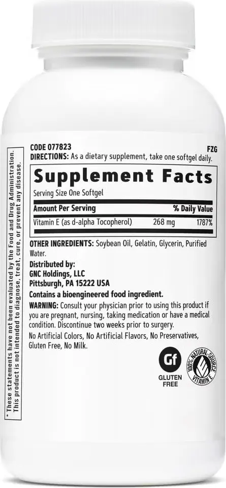 GNC Vitamin E 268 mg უზრუნველყოფს ძლიერი ანტიოქსიდანტურ მხარდაჭერას, მხარს უჭერს გულ-სისხლძარღვთა სისტემას, თავისუფალია გლუტენის, რძის და ხელოვნური ინგრედიენტებისგან.