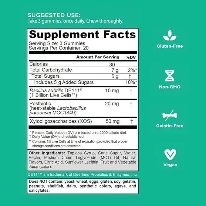 - ✔ Prebiotics, Probiotics და Postbiotics ერთად ერთ გემრიელ გუმში