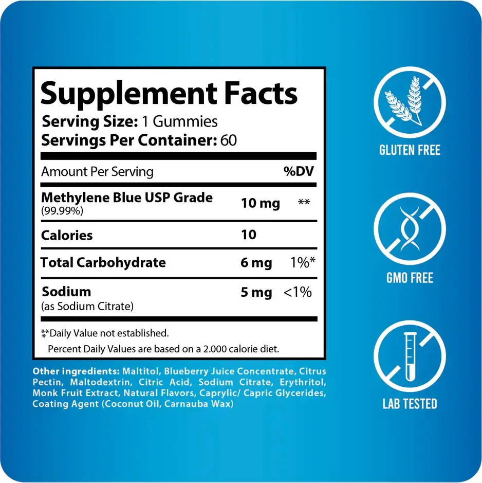 “მეთილენის ლურჯი ჟელე — გონებრივი სიცხადე, ენერგია და მიტოქონდრიული დაცვა. 10 მგ USP ხარისხის ფორმულა, სასიამოვნო მოცვის გემოთი.”