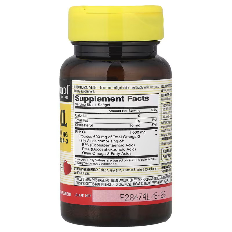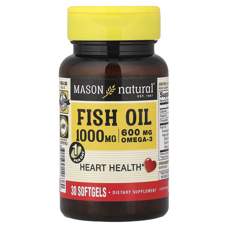 Mason Natural Omega-3 Fish Oil 1000 mg არის მაღალი ხარისხის საკვები დანამატი, რომელიც შეიცავს 1000 მგ გასუფთავებულ თევზის ზეთს. ის არის EPA (ეიკოზაპენტაენის მჟავა) და DHA (დოკოზაჰექსაენის მჟავა) ცხიმოვანი მჟავების მდიდარი წყარო, რაც სასიცოცხლოდ მნიშვნელოვანია მთელი ორგანიზმის ჯანმრთელობისთვის. პროდუქტი არ შეიცავს გლუტენს, ხელოვნურ საღებავებსა და მავნე დანამატებს, ხოლო თევზის ზეთი გაწმენდილია მძიმე მეტალებისგან (მაგ. ვერცხლისწყალი).მისი მიღება რეკომენდებულია გულ-სისხლძარღვთა სისტემის, ტვინის ფუნქციონირებისა და ზოგადი იმუნიტეტის გასაუმჯობესებლად. 🐟💊🌿