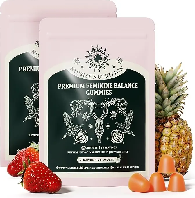 „NIUSISE Feminine Balance Gummies – 60 გუმი ქალებისთვის. მხარს უჭერს ვაგინალურ ფლორას, pH ბალანსს, იმუნიტეტს და საერთო ქალთა ჯანმრთელობას, ვეგანური და გემრიელი ფორმულა.“