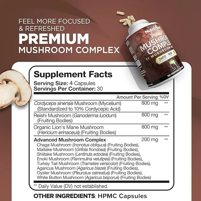 Premium 11 Mushroom Blend შეიცავს 11 კონცენტრირებულ სოკოს, ძლიერი 2600 მგ დოზით, მხარს უჭერს ტვინის, სხეულის და იმუნური სისტემის ჯანმრთელობას.