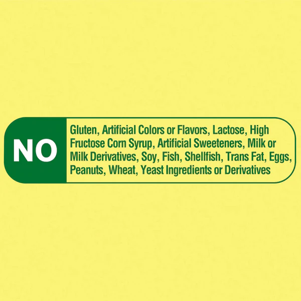 სუფთა შემადგენლობა: არ შეიცავს გლუტენს, ხელოვნურ საღებავებს ან არომატიზატორებს, ლაქტოზას და მაღალი ფრუქტოზის სიმინდის სიროფს.