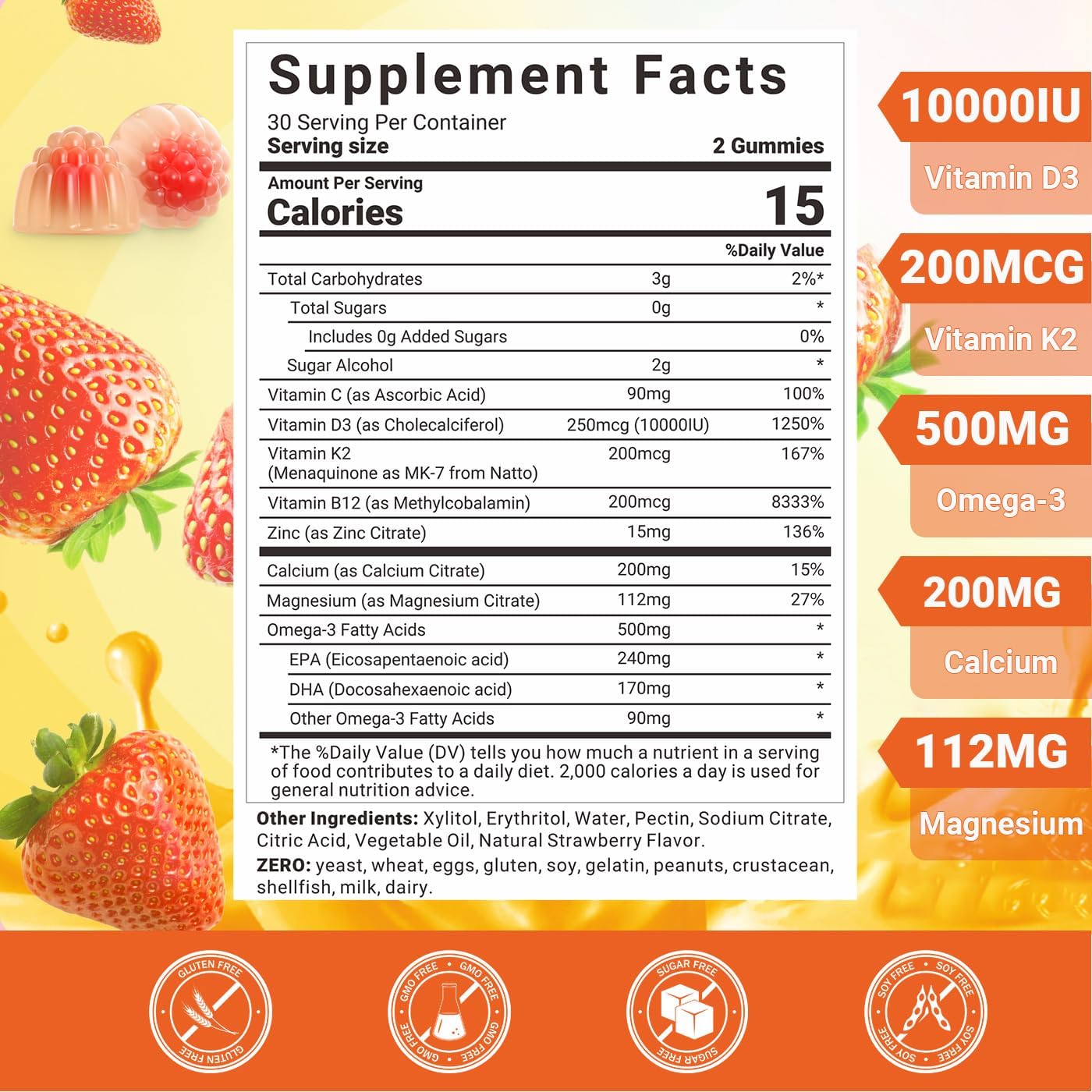 ☀️ ეს არის გემრიელი, ფორთოხლის არომატის მქონე საღეჭი კანფეტები, რომლებიც აერთიანებს ორ უმნიშვნელოვანეს ცხიმში ხსნად ვიტამინს — D3-ს და K2-ს (MK-7 ფორმით). 💪 ეს მძლავრი კომბინაცია შექმნილია იმისთვის, რომ უზრუნველყოს კალციუმის სწორი ათვისება და მიმართვა ორგანიზმში, რაც გადამწყვეტია ძვლების, გულისა და იმუნური სისტემის ჯანმრთელობისთვის.